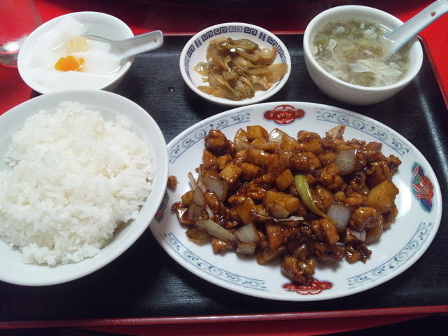 本日のランチに麻婆茄子があって小躍りしていたら、揚げ鶏肉の特製ソース掛けもあったり。