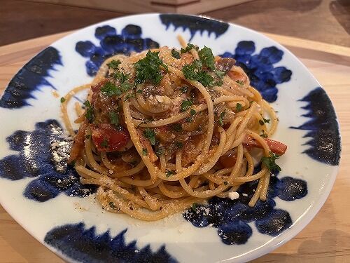 メインは、自家製ベーコンとバジルのトマトスパゲティ。