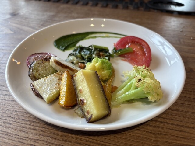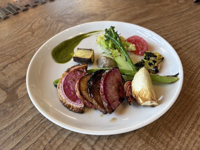 特に、前菜の焼き野菜はシンプルながら野菜本来の甘みが引き立ち、毎回楽しみな一品。農家さん直営ならではの鮮度と味わいが感じられます。