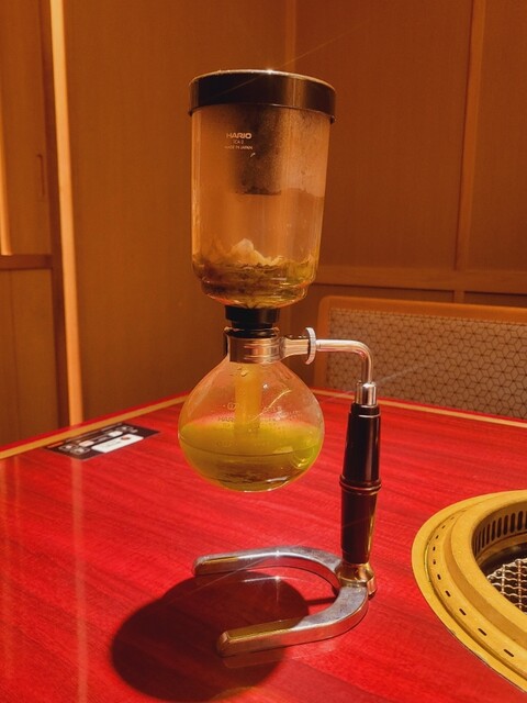 締めのごはんは「肉茶漬け」。なんとお出汁はサイフォンで淹れるスタイル。湯気とともに立ち上がる出汁の香りが広がります。