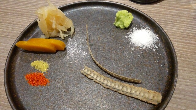 前菜のウェット感のあるカラスミと切り干し大根のガリと揚げた骨煎餅