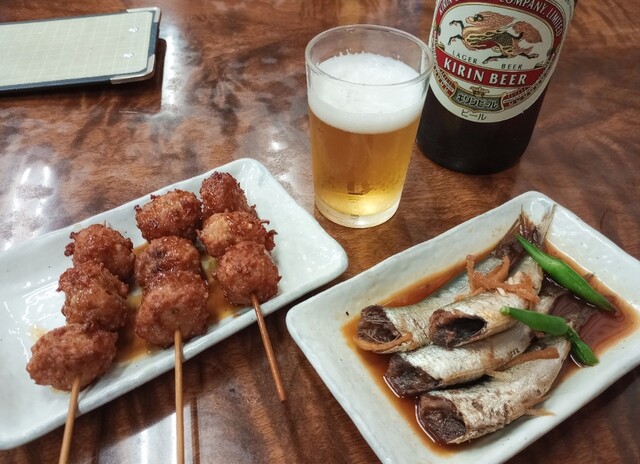 大瓶キリンをオーダーし「乾杯」。神戸はなかなか大瓶がない。うれしいではないか。