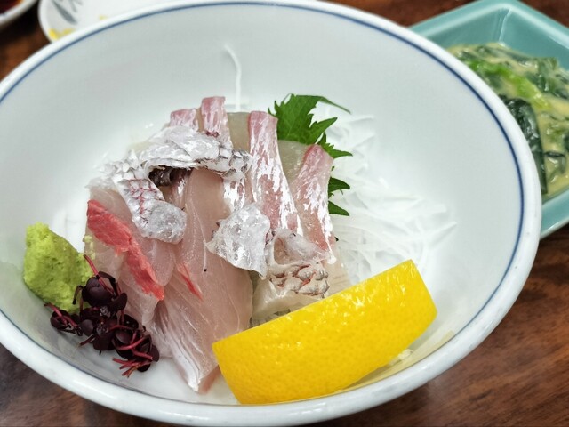 鯛とカンパチ(食べかけ、申し訳ない)。一膳飯屋のレベルではない。うめー。