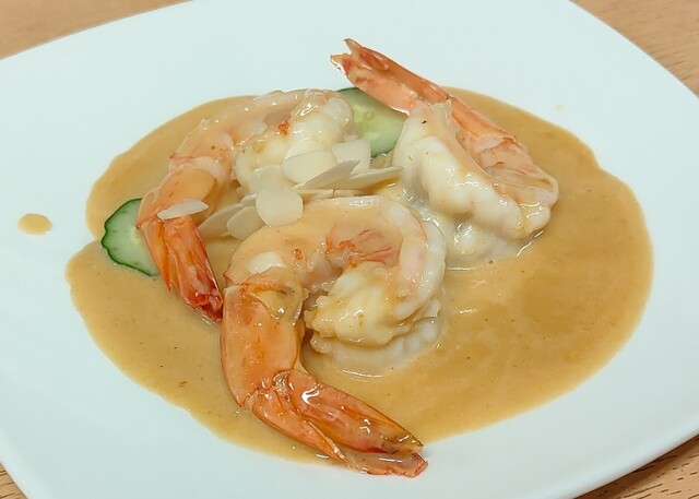 Butter prawn。東南アジアの代表料理のひとつ。大ぶりのエビを用いたエスニック料理。ここもでっかいエビです! 値段も納得。プリップリで美味しい!