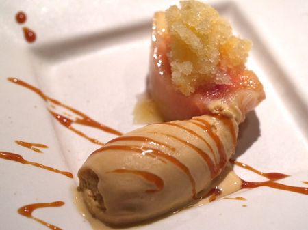 デザートは、桃のコンポートの上にスイカのシャーベット