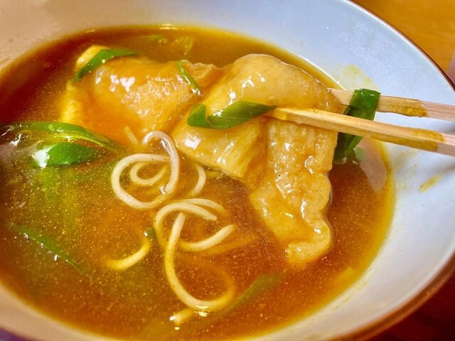 出汁の効いた程良い辛さのカレーと、甘いおあげがめちゃくちゃ合います