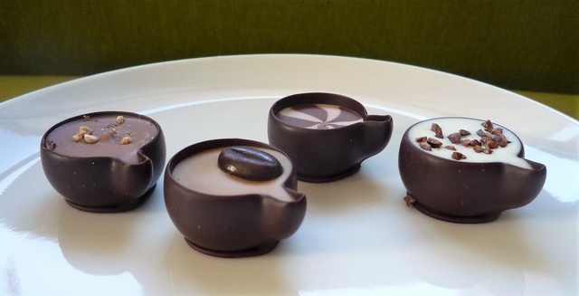コーヒーカップ型のチョコレートにクリームやジャンドゥーヤ、