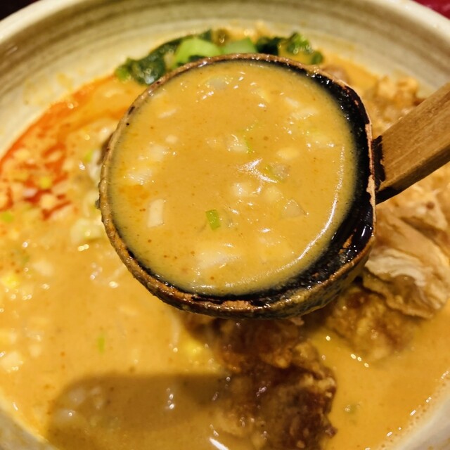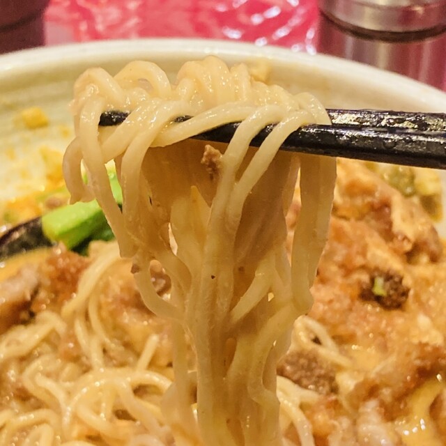 麺、スープと食べ進める、排骨を食べると濃厚な坦々の味が勝る
