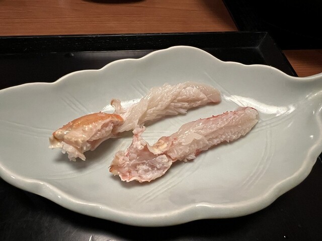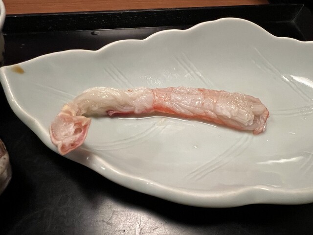 ⇒食べ方はお好みとのことで、そのまま、塩、スダチ&塩、カニ酢、醤油全部で食べた。レアめとは違った触感と味で絶品。
