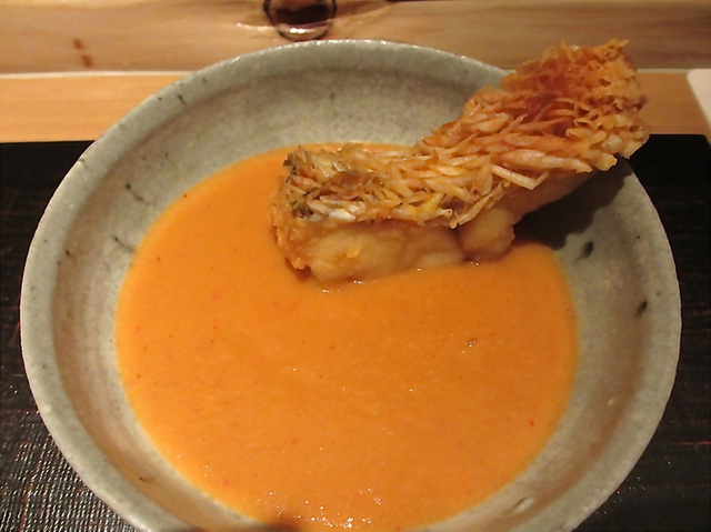 甘鯛の焼き物とトマト、サクラ海老のビスク