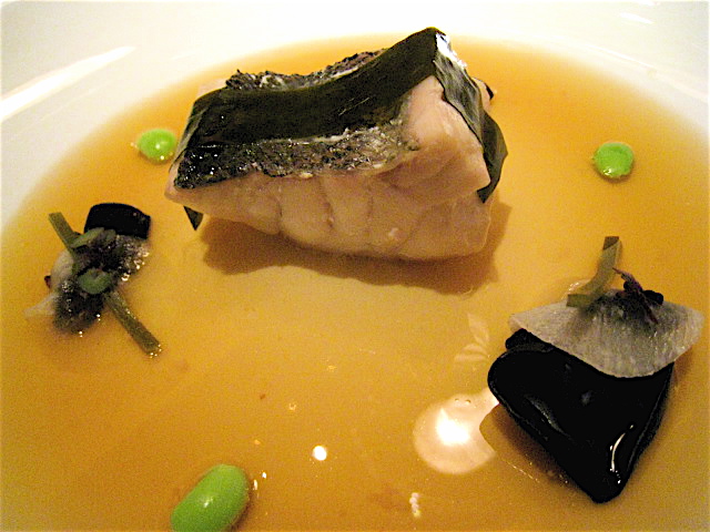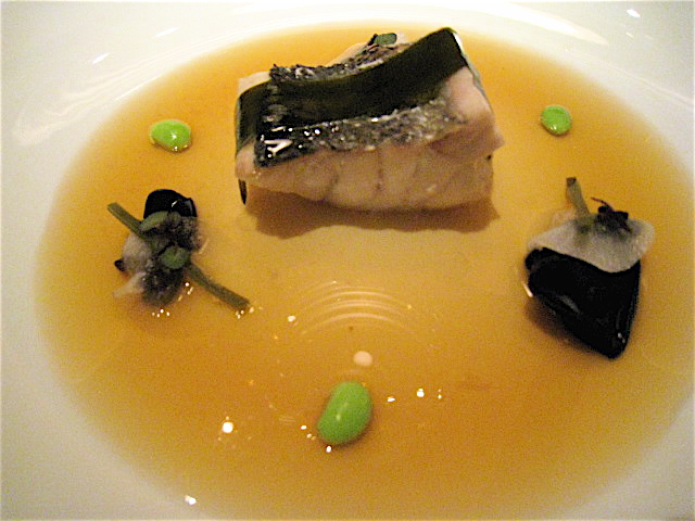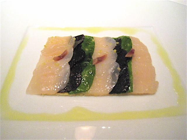 登場した途端に思わず「うーむ!」と唸ってしまったお品。数ミリのうすいトースト(?)の上に帆立貝、バジル、そして黒トリュフが美しく芸術的に並び、神々しいまでの輝きを放っている。バジル、黒トリュフという一見、個性が強そうな素材をミルキーな帆立貝と合わせて全く別物に仕上げている。食感はたしかに帆立貝なのだけれど・・・。この料理は白ワインと合わせてもう一度食べてみたいかも(笑)。