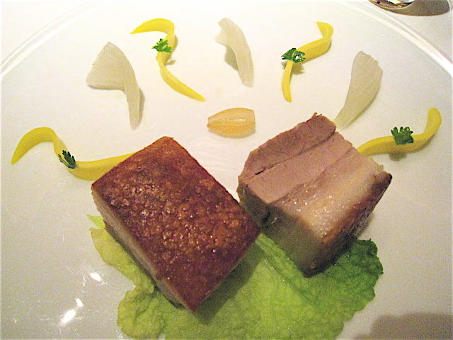 たぶん当日、最も「和」を強く意識したお料理。熱々のお皿に載ったほとんど立方体に近い鱸の上には昆布(!)が。彩りのグリーンピースとまたもや黒トリュフ(!)が・・・と思ったら、それぞれのお皿に熱々の和風出汁がかけられていく。と、何だか懐かしいような「磯のパヒューム」がお皿からフンワリと立ちのぼっていく。まさに、目の前に「海」を感じさせる素晴らしい演出っ!!そしてこの鱸がフンワリ&ホロホロでとてもおいしいのだ。まさにフレンチに和のエッセンスを巧みに採り入れた芸術作品といえるかもしれない。かなり感動!!