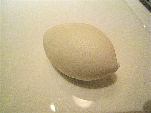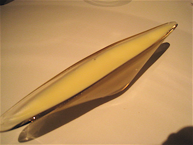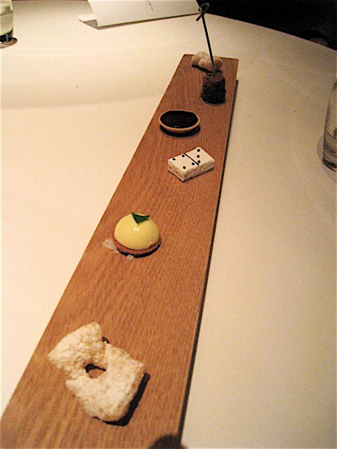 色々と細かく説明してくれたのだけれど正式名称は失念(笑)。「前菜前の前菜」ということで登場した此方はバジルをほんのりと効かせた逸品。写真ではボケボケでわかりにくいのだけれど、オレンジやらナッツ系やらが鋭角的にレイアウトされ、深みのある繊細な味わいを醸し出している。