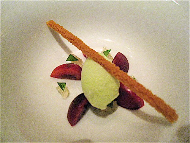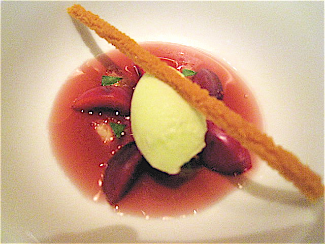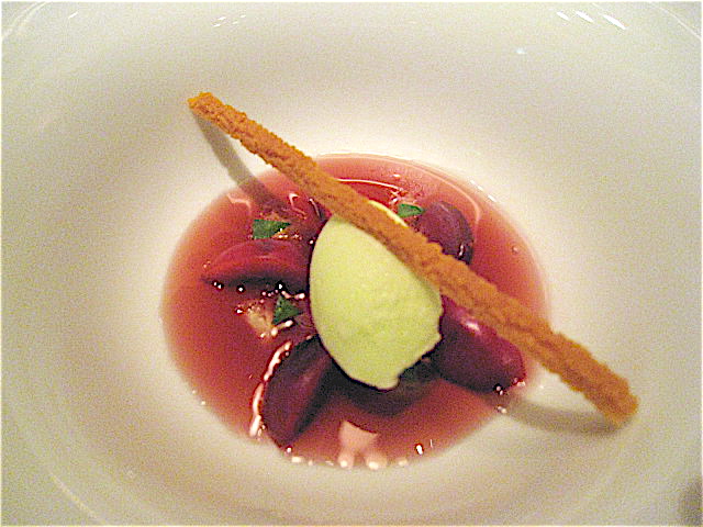 アヴァンデセールは彩りもかわいらしいさっぱり系のバジルのアイスクリームとさくらんぼが登場した。上にかけられる木いちごのソース(たぶん)もさっぱりと品の良い味わい。