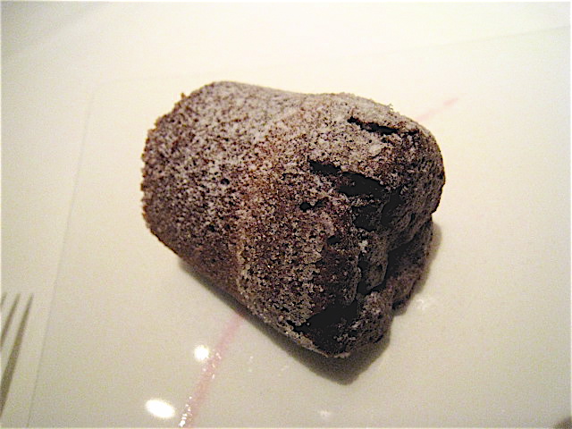 すでにお腹はいっぱいになりつつある私たちの前に、今度は4×3×3.5センチぐらいの立方体×2が登場した。沖縄で育てられたという幻の豚肉「アグー豚」だ。豚特有の臭みが少なく、コレステロール値が普通の豚の4分の1ながら、旨み成分のグルタミン酸が豊富なことで話題となったあの豚だ。爽やかな食感のグリーンマンゴも沖縄産だという。スタッフの方にソースをかけていただき、非常に扱いにくいがとてもよく切れるナイフで切り分けていただく。アグー豚の皮はパリパリっ!アジアンテイストの香辛料が用いられているのか、オリエンタルな風味が微妙に鼻をくすぐる。写真では脂身がちょっと気になるかもしれないが、「コレステロール値は普通の豚の4分の1!」ということなので(えっ?)パクパクといただいてしまった。足りなかったらソースは自分で増量できる。おいしいものをいただいた後で申し訳ないのだけれど、正直、これは一つでよかったかもしれない(爆)。しばらく豚さんはノーサンキュー!の気分だった。