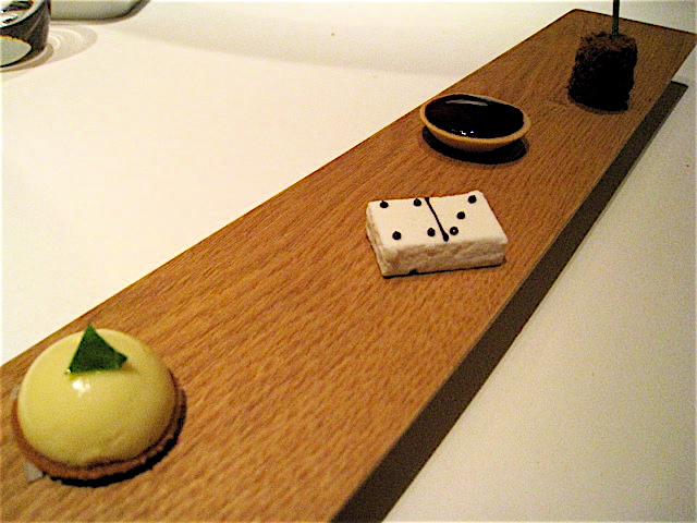 トマトのコンソメゼリー寄せ、粉状にしたとうもろこしを軽くやいたもの、セップ茸のカプチーノ仕立てと、すでに皆様のレビューでお馴染みの定番でもあるらしい3種のフィンガーフード。それぞれに個性があっておいしいのだけれど、個人的にはトマトが一番気に入ったお品。