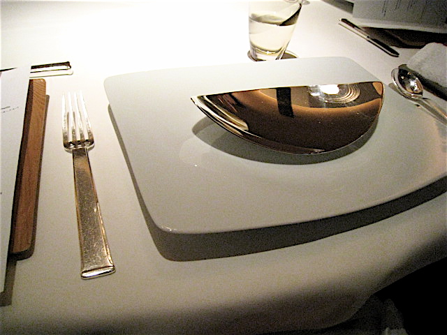 やっと全員が揃ったところでお席へ。ホール左手にあるガラス張りの広いキッチンではスタッフの方々が忙しそうに動き回っている姿が見える。アニバーサリーということを告げてあったせいだろう。一番奥にある静かなお席へと案内された。★2つのテーブルセッティングはさすがに素晴らしい。