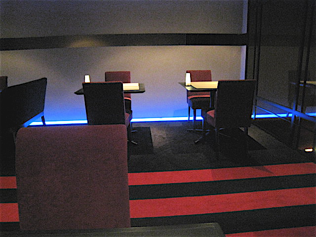 エレベーターでB1Fに下りると深海の底に潜ったような青(テーマカラー?)と白(テーブルとライト)のスタイリッシュな漆黒の空間が目の前に広がる。カーペットは深紅でゴージャス感を醸し出している。