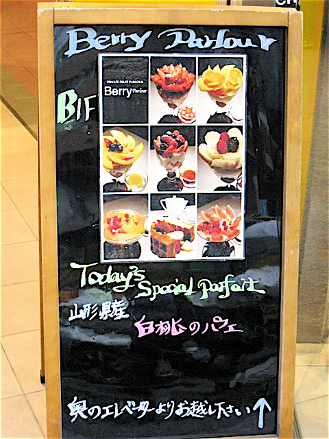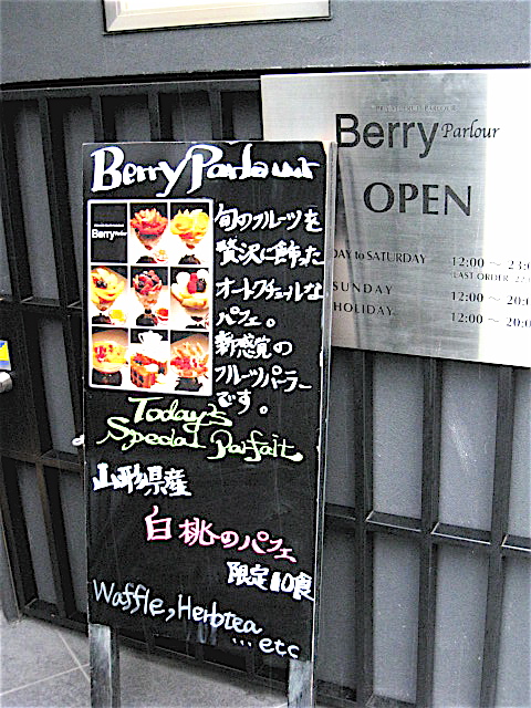 久しぶりに青山界隈で打ち合わせ。道行く人々もさすがにお洒落な方々が多い。8月にしては少しだけ涼しい日だったので渋谷か原宿までお散歩がてらに歩いてみることにした。色とりどりの美しいアートケーキのディスプレイが目にも鮮やかな「ベリーカフェ青山本店」の前を通りかかったちょうどその時、「Today's Special Parfait 山形県産白桃のパフェ(限定10食)」とボードに記された文字が私を呼び止めてしまった(爆)。「呼んだ?」と思わず振り返る(笑)。。。