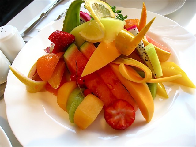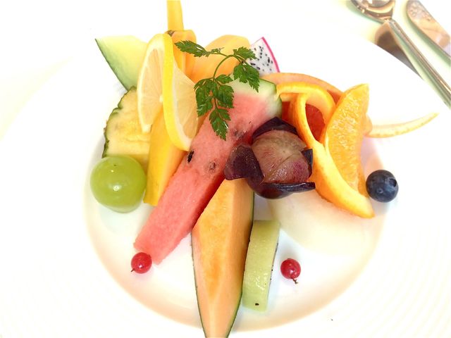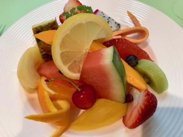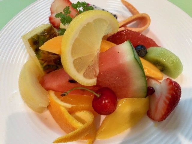 奥に控えめに佇んでいるのがマスクメロン、紫色のぶどうが岡山産ピオーネ、グリーンのぶどうがやはり岡山産マスカット・オブ・アレキサンドリア、すいか、夕張メロン、オレンジ、グレープフルーツ、マンゴー、キウイ、ドラゴンフルーツ、レモンなどが美しく盛られている。