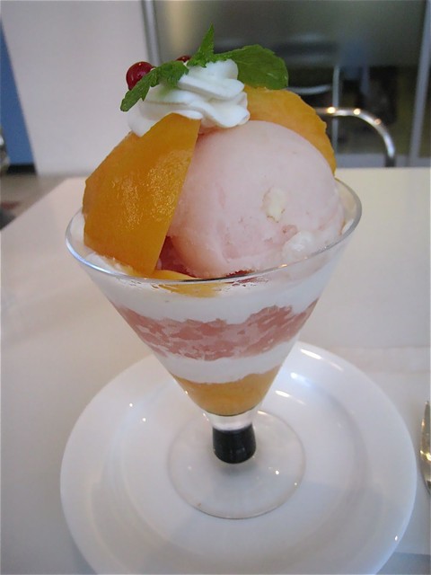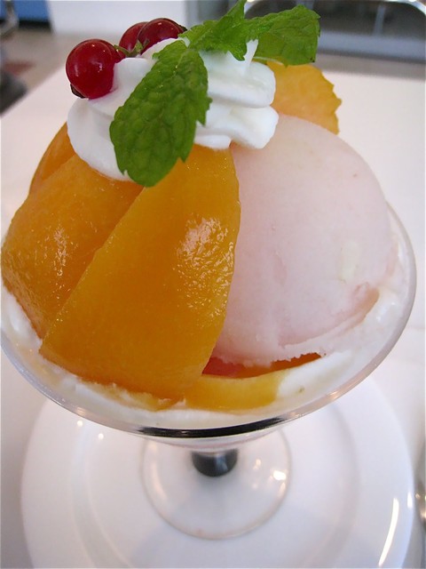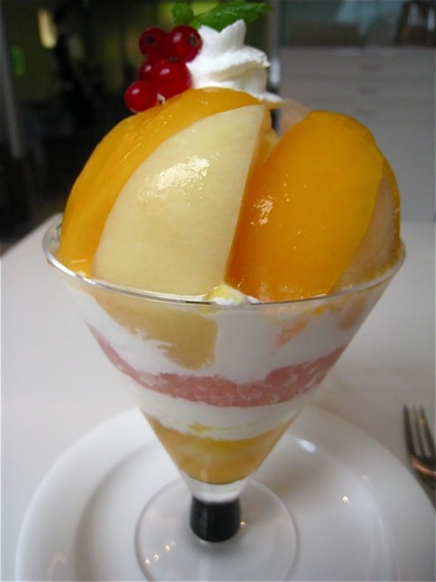 今回の黄金桃は全体的にマンゴーっぽい感じが強いような印象。が、そのように酸味が強い分、桃シャーベットやバニラアイス、そしてパフェグラスの中の三層になった「桃味のするなかき氷バージョン」「桃風味の生クリーム」「黄金桃のソース」とのバランスはなかなかよろしいように感じた。