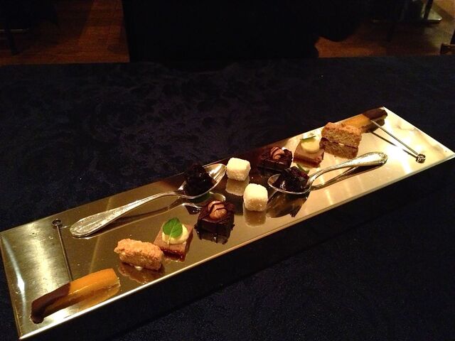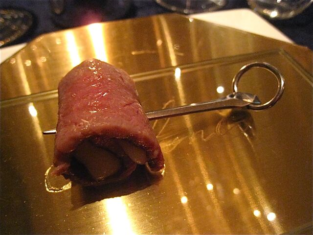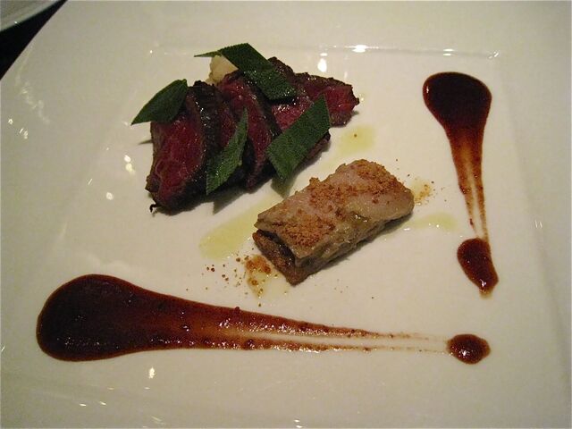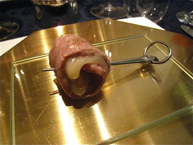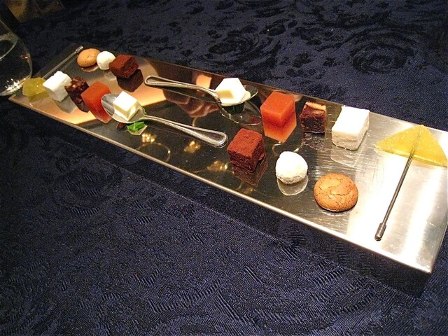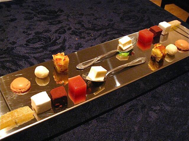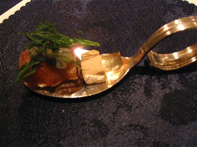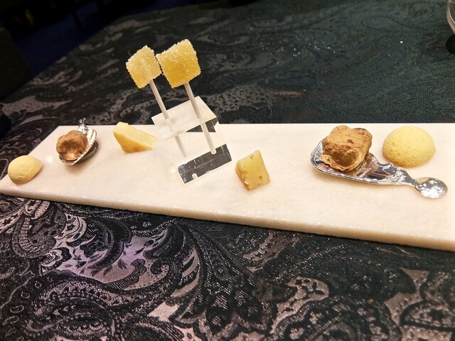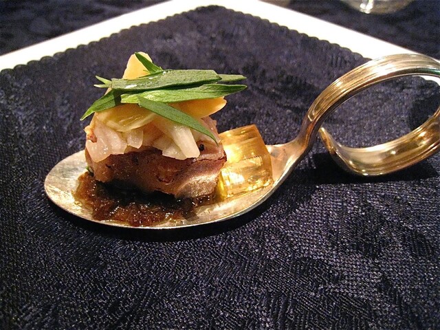 そしてメインはなんと!お馬さんだった(驚)。私は知らなかったが、フランス語圏では馬肉食は普通にあるらしい。日本国内で馬といったら「桜鍋」か「馬刺し」を連想してしまう訳だが、当日は熊本産ノルマン種馬ハラミのローストということだった。これをハチミツ、レモン、オレンジ皮、各種パウダー類を香辛料を加えた赤ワインや赤ワインビネガーで煮詰めたソースでいただく。これがまた牛肉のハラミのように柔らかく、またおいしいのである。しかも横には私の大好物の「フォアグラちゃん」が鎮座ましましているではないかっ(喜)。この「馬ハラミアッロースト パーネスペツィアート」は「ファロット 赤海老とフェンネルのプレア」同様、私が当日最も気に入ったお料理だった。