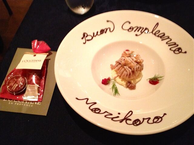 サローネ恒例のバースデー・タイムだ。キャンドルが灯されたデザートがシズシズと運ばれ・・・なんとっ!私たちのテーブルにやってきた(驚)。