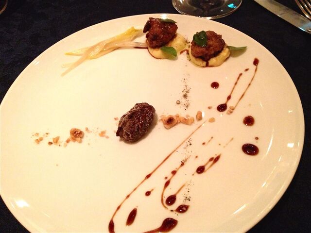 「アニメッラ アル カッフェ」は写真の通り、遊び心にあふれた楽しい一品。ポレンタの上に鎮座ましましているのはマルサラとスーゴのソースをからめたリードヴォー。チコリとミントが添えられ、真ん中のコーヒーのジェラートの周りをヘーゼルナッツが取り囲んでいる。