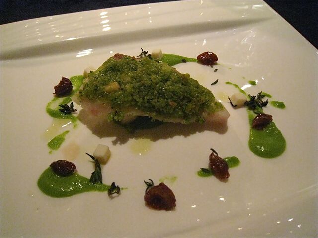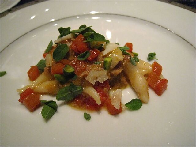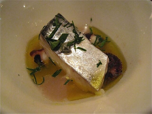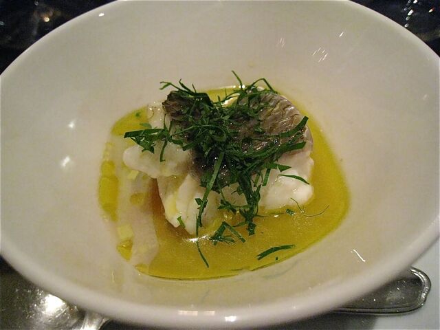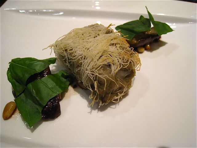 「カダイフ」とは写真の中の糸のような細い麺のような衣のこと(たしかパスタの一種と聞いたような・汗)。シチリア産の塩オレガノでマリネしたスズキとペコリーノ、ナスのピューレを「カダイフ」で包み、オーブン焼きで仕上げたのが、「鱸、カダイフのニード」だ。カダイフの下には松の実とチョコレート(!)、お塩のソース。さらに揚げてからマリネされた米ナスが添えられている。チョコレートと鱸(とカダイフ)を合わせるなんて、それだけでも十分に私の想像を超えているが、これがまたかつて経験したことのない馥郁たるお味なのだ。これは当日感動したお料理の一つ。機会があればまたいただいてみたいかも。