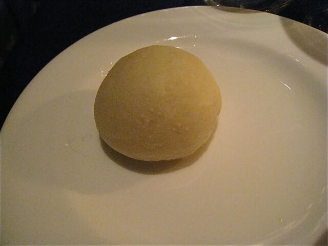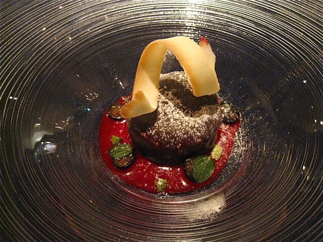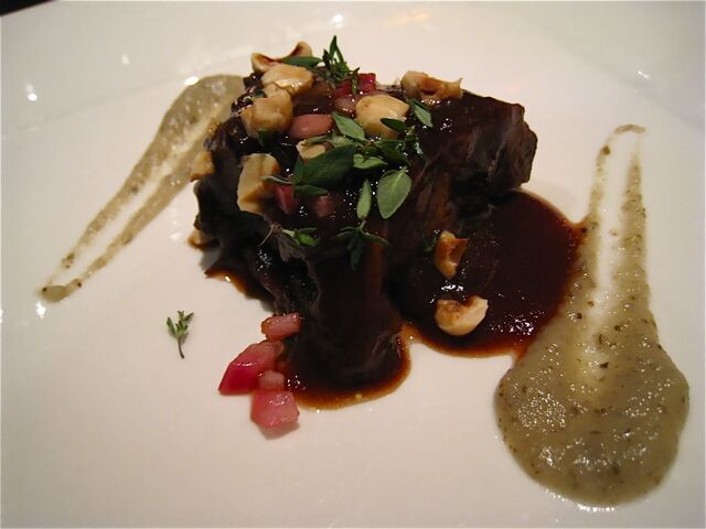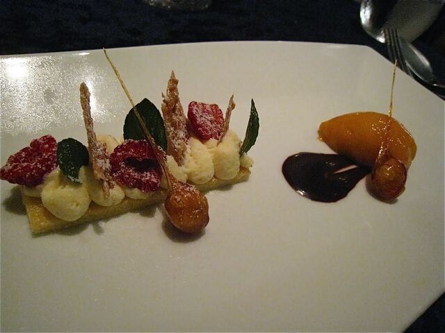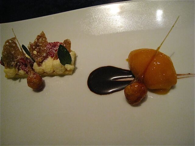 「短角牛のインウミド」は、牛バラ肉を赤ワイン、香味野菜、トマトペーストでトロトロに煮込んだ牛バラ肉。横に添えられているのはキクイモのピューレ、お肉の下にはソテーしたトレビス、トッピングハヘーゼルナッツとタイム、赤いのは酢漬けの玉ネギ。見栄えもお味も素晴らしいメインディッシュだったのだけれど、今まで登場したお料理が素晴らしすぎた分、いささかメインがぼやけてしまったような印象も。。。今回はそれぐらいに「密度の濃い」コースだったということなのだろう。