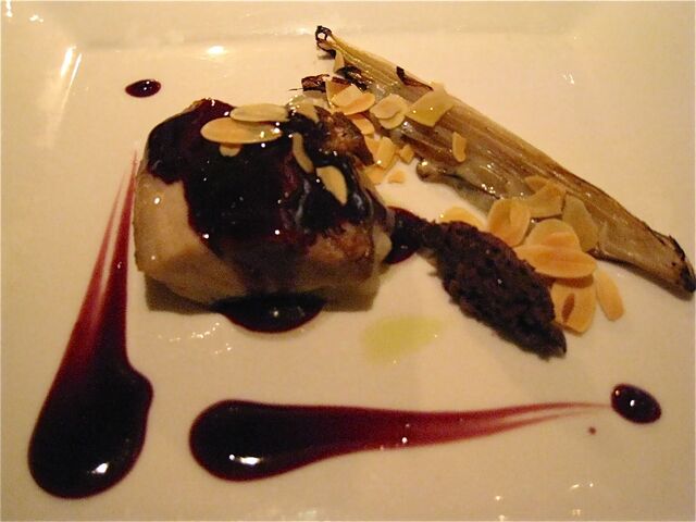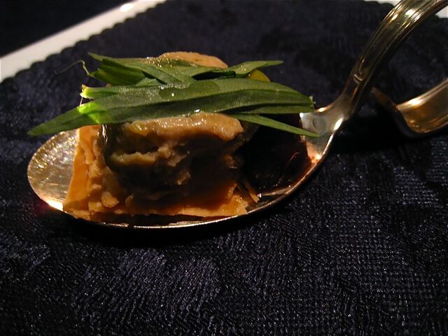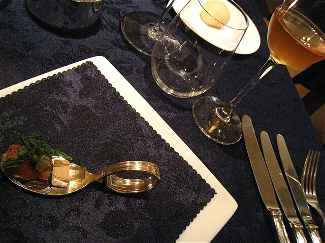 「南瓜とフォアグラのアッビナメント」の「アッピナメント」とは「マリアージュ」(組み合わせ)の意。写真ではわかりにくいのだけれど、フォアグラのムースとうなぎ、南瓜のピューレ、ドライいちじく、キャラメリゼしたくるみ、ミントなどがお皿の中でオーケストラを奏でているイメージ。高くそびえているのは「パートブリック」とのことで、春巻きの皮のような不思議な食感だった。