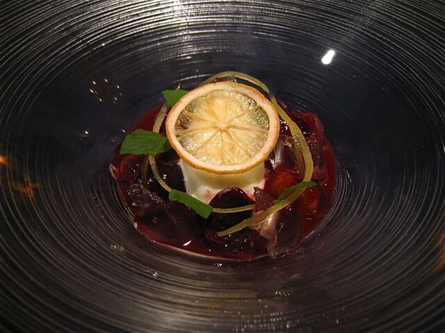「アメリカンチェリーのズッペティーナ マスカルポーネのジェラート」は、マスカルポーネのジェラートが赤ワインで煮込んだアメリカンチェリーのシロップの中に浮かんでいるデザート。シロップにはキルシュゼリー、レモン皮コンフィ、ミントなどが添えられ、トップには王冠のようにレモンセッキが!!全体的にサッパリとした食感のアレンジは本日のコースを締めくくるに相応しい一品だった。
