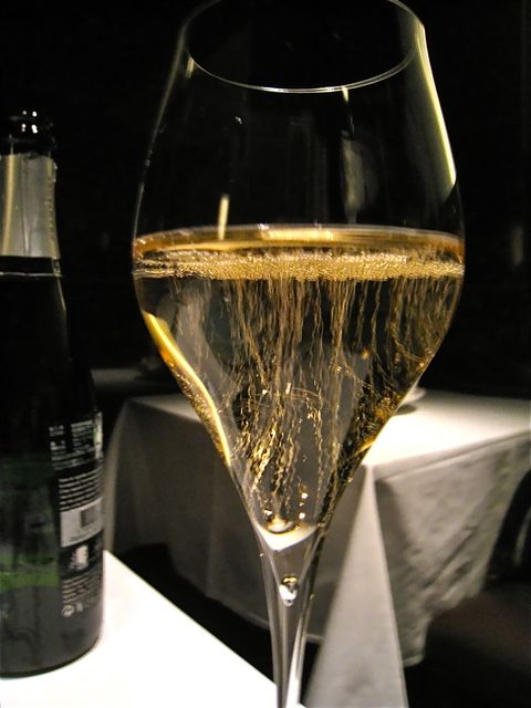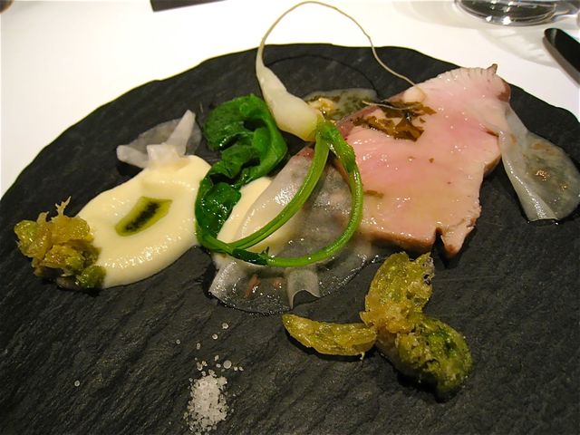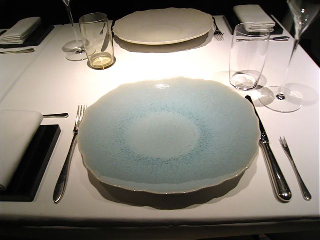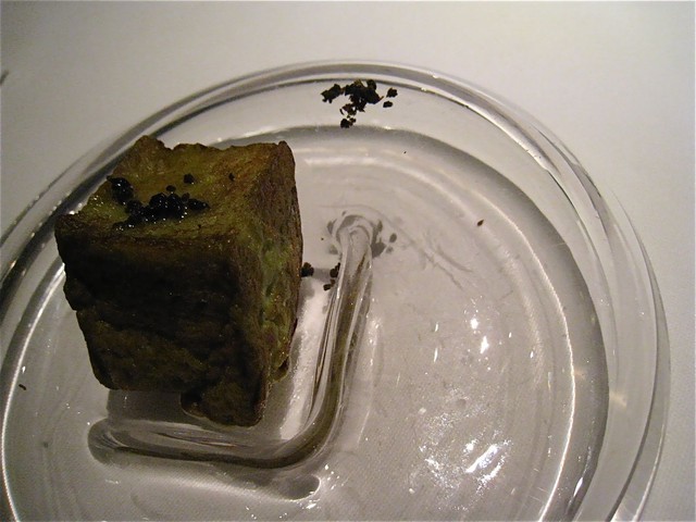 此方の定番アミューズとして有名な「温かいグリーンオリーブ」。皆さまもご指摘のように四角くかたどられた専用のガラスのお皿にちんまりと収まっている。ブリオッシュのような、スフレのようなトロトロの生地の中にグリーンオリーブが練り込まれていて、一口いただくと口の中にオリーブとバターの香りがフワ〜ッと広がっていく不思議な食感。上の黒い粒々はなんとっ!!キャビアではなくて黒胡椒がーー!!ほのかな塩気を感じさせるこのアミューズがシャンパンととてもよく合う。全然関係ないのだけれど、「くろぎ」の「焼き胡麻豆腐」の食感に少し似ているような気がしたのは、「温かさ」と「トロけていくような柔らかさ」のせいかもしれない(笑)。