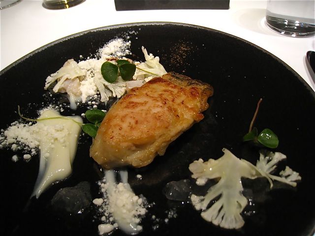 衣をつけて焼きあげた肉厚ぷっくりの「厚岸産牡蠣」は、カリフラワーのサラダと共にいただく。パウダー状のシャーベット、ジェル状のもの、そのすべてがカリフラワーをアレンジしたものなのだそうだ。この「カリフラワー・マジック」(!)に合わせるのは「Sancerre 2010」。