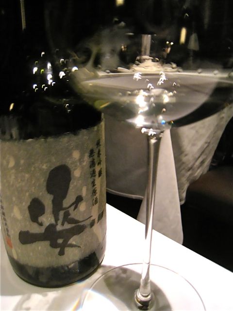 さすがに普段からよく嗜んでいるだけのことはある友人たちだ(笑)。その、一見、グラスワインのような液体は、「姿(黒姿)純米吟醸生原酒 “Black Impact”」とのこと(笑)。日本酒好きの川手シェフのお気に入りということで、本日の「ひみの寒ぶり」のお料理に合わせての特別な1杯だったらしい。シェフの粋なはからいに多謝!!
