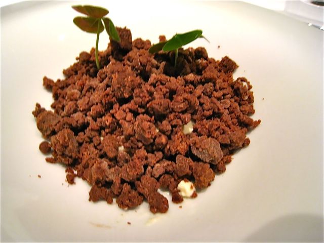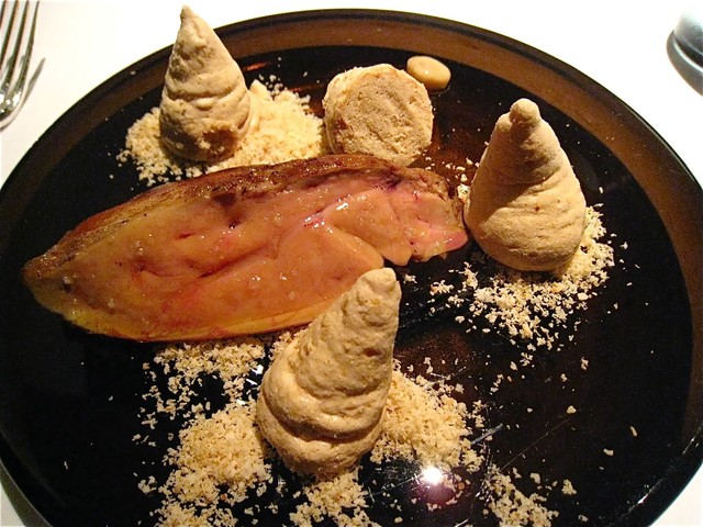 此方を訪問したら「一度は食べてみるべきお料理」ということで選んだお品。目の前に置かれたお皿にはメレンゲと細かく砕かれたヘーゼルナッツしか見あたらない(爆)。内心、「私のフォアグラはどこっ?」と探してしまったが、熱々の「フォアグラ」(しかも肉厚!)が別皿でサーブされるので心配は無用だ(笑)。