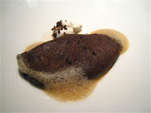 まさかフロリで「目玉焼き?」というのは冗談で、黄味部分が卵の黄身とミモレット、白身部分が卵の白身とマッシュポテトなのだそうだ(驚)。辛くない胡椒のツブツブの正体は「黒トリュフ!」だった。大好きなフォアグラちゃんをミモレットとマッシュポテト、さらにはトリュフといただけるなんて、まさに夢の饗宴だ。