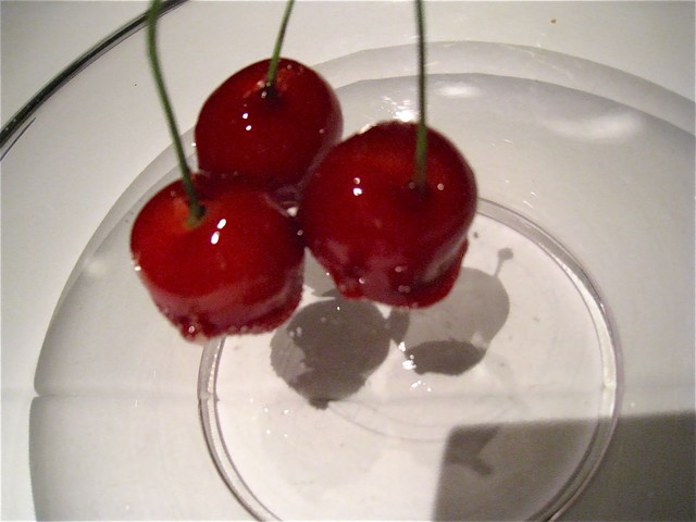 食後のコーヒーを飲みながらいただくプチフールは「佐藤錦」のキャラメリゼ。写真の通り、宙に浮いているような感じでサーブされる佐藤錦は驚くばかりの大粒(!)。ゼリーのようなプニュプニュの食感と佐藤錦本来の果実味をダイレクトに味わえる贅沢なプチフールだった。