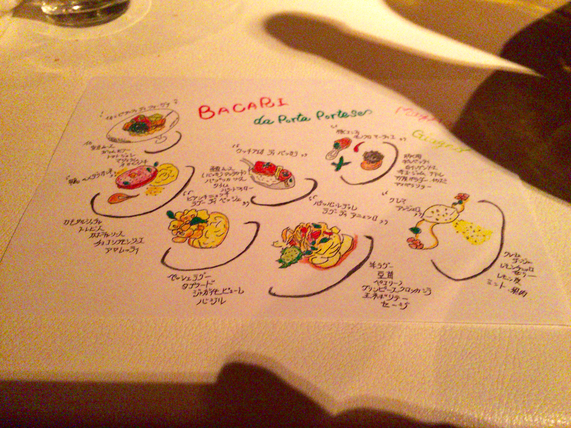此方は「イタリア自然派ワインと料理のProposta(提案)をお楽しみください」という通り、お料理に合わせた厳選ビオワインが楽しめるのがウリのお店だ。しかも酒量(?)に合わせて、9種(4,500円)、7種(3,500円)、5種(2,500円)が選べるだけでなく、すべてのワインがリストアップされ、しかもそれぞれのワインの産地までをわかりやすく記載したイタリアの地図までが各テーブルに用意されている。