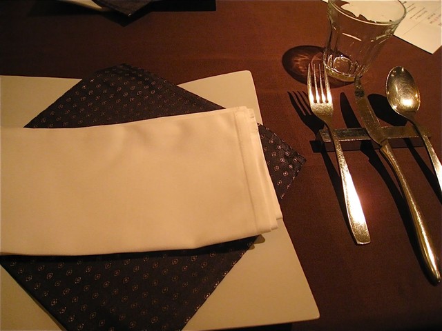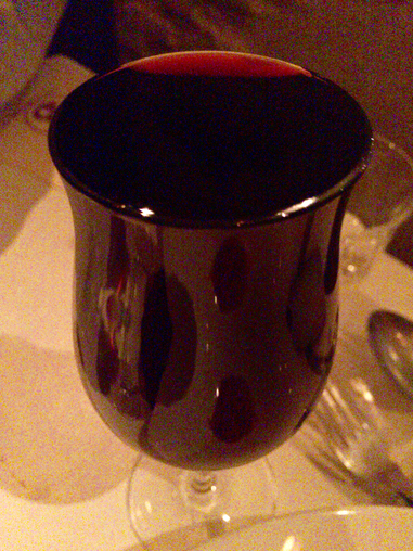 当日のメインは「仔牛の赤ワイン風味」。黒いお皿の上の白いソースは実はお皿の模様(爆)。食べようとして剥がれないので少々焦った(笑)。肝心のお肉はホロホロと柔らかくてほどけるよう。但し、若干、お味は濃すぎるような印象もなきにしもあらずだった。ま、この部分は好みもあるのだけれど。。。