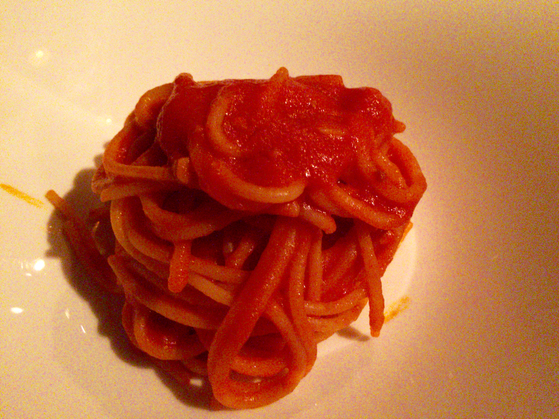 そして二皿目のパスタはサローネグループ定番の「スパゲッティ ポモドーロ」。お腹の空き具合に応じてお好みの量をお願いすることができる。グループ内では「ランチ」で提供しているお店が多い中、「ディナー」に組み込んでいるのは此方だけとのこと。私はトラアイルで40グラムを所望。ちなみにイタリア暮らしが長かった母に言わせると、普通は一人80グラムが平均ということらしい。