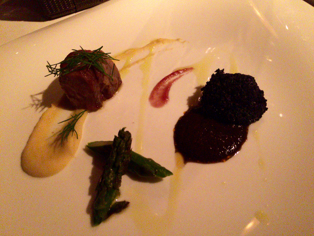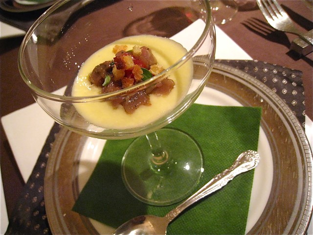 二品目の「カツオのタルターラ」は、アーティチョークのムースにガーリック風味のカツオのタルタル(のことらしい)合わせたもの。ほんのり苦みのあるアーティチョークのムースが◎。おいしかった♪