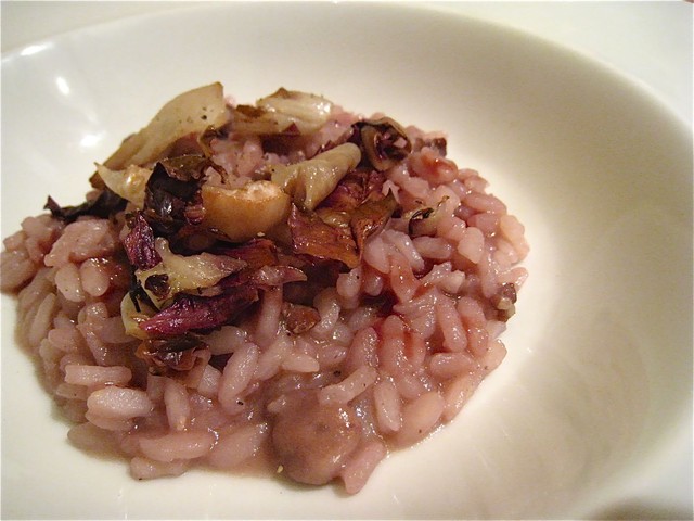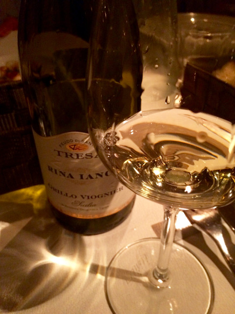 当日、特に気に入ったものに◯をつけてみたが、前半に集中しているのは、やはりそれだけワインに合う感じの「ゴージャスおつまみ系お料理」だったということだろう。特に感動が大きかったのは、二皿目の「小柱とオリーヴ、ウーヴァセッカのインサラティーノ」」と四皿目の「リゾット」。前者のヒヨコ豆のペースト(たしか)とリゾットのワサビ風味は特に印象に残った。