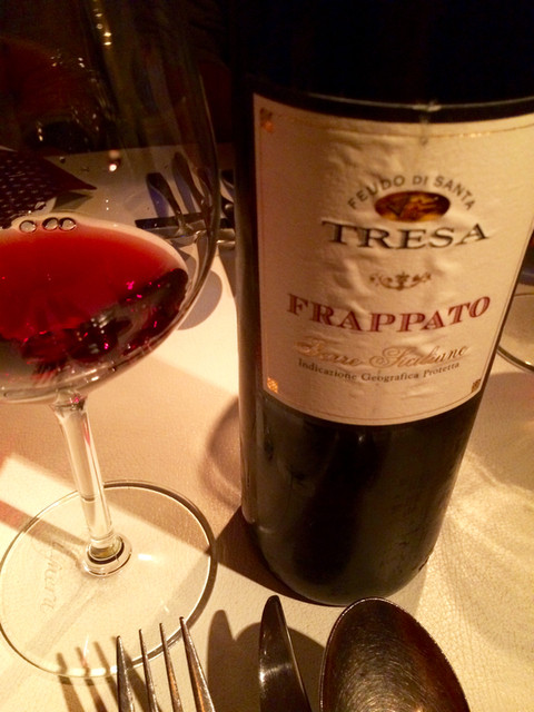 そうそう、食べたいだけのポモドーロに合わせて、なんとっ!!此方の素晴らしいパフォーマンスが9杯目のワイン!!「Il Vei Val Tidone」を「ストップ!」というまでグラスに注いでくれる(喜)。もちろん「すりきり」のあふれる一歩前までOKとのこと(爆)。本当は「嗜む程度」にしかいただけない私なのだけれど、ここは食べログの皆さまのために敢えて「すりきり!」をお願いする。表面張力のマジックは此方でも健在だった(笑)。この「すりきりワイン」の感動的なパフォーマンスのお陰で、ポモドーロで凹んだ気分もすっかりと回復(笑)。もちろん上機嫌で飲みきったのだった(呆)。
