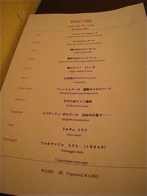 酒飲み仲間たちと雨の夜に再訪。グループ4店舗の中では最も敷居が低くてカジュアル感覚で利用できるレストランだ。10皿から成るおいしいイタリア料理(4,200円の1種類のみ)を楽しみながら、おいしいビオワイン(9種(4,500円)、7種(3,500円)、5種(2,500円))があれこれ楽しめるという、まさに「酒飲みのための店」といっても過言ではないだろう。この日も全員が当然のごとく9種類コースでゴーっ!!