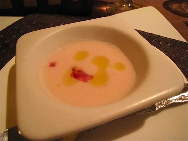 まずはスプマンテの「La JARA Pinot Grigio Brut Rose」で乾杯。おつきだしは「ゴルゴンゾーラのムース」。冷たいスープの中にアイスクリームのように浮かぶ、まるでデザートのような一皿。さっぱりとしたフルフルの食感なのだけれど、泡雪のようになくなっていってしまった(笑)。