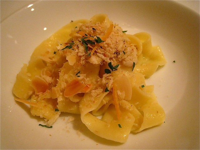 一品目のパスタは「フェットゥチーネ 燻製カジキのソース」。テーブルの脇に運ばれてきた時から、燻製カジキとオレンジの香りがお皿から芳ばしく立ちのぼる一皿。このパスタは結構好きかも!!