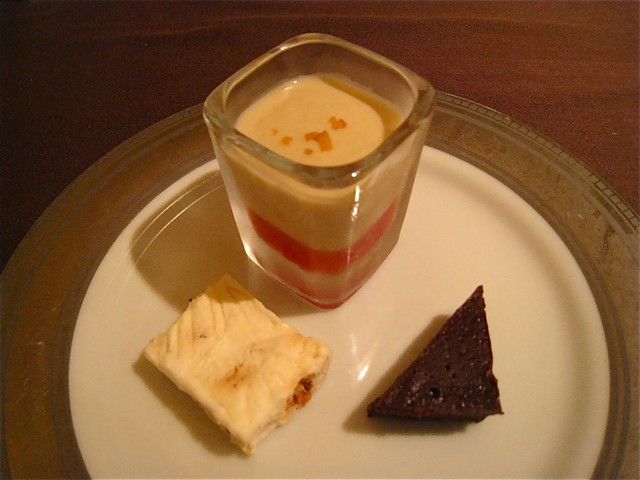 「ドルチェ ミスト」は、オレンジのゼリー&シナモンのカスタード、胡桃のセミフレッド、チョコレートケーキの3種類。オレンジのゼリーがさっぱりとしておいしかった。飲み物は別料金ということなので、デザートワインを所望(オイオイ・笑)。すっかりと良い気分に出来上がってごちそうさま!!