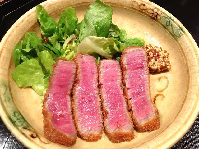 〆はいつもの「ビフカツ」。栃木、はなこ、牝牛、3歳などとメモがあるが、もしかして「はなこさん」をいただいてしまったのだろうか(謎)?写真の通り、はなこさんは素晴らしいサシ加減。申し訳ないながらも、サクサクっとした衣とともにおいしくいただいてしまったのだった。