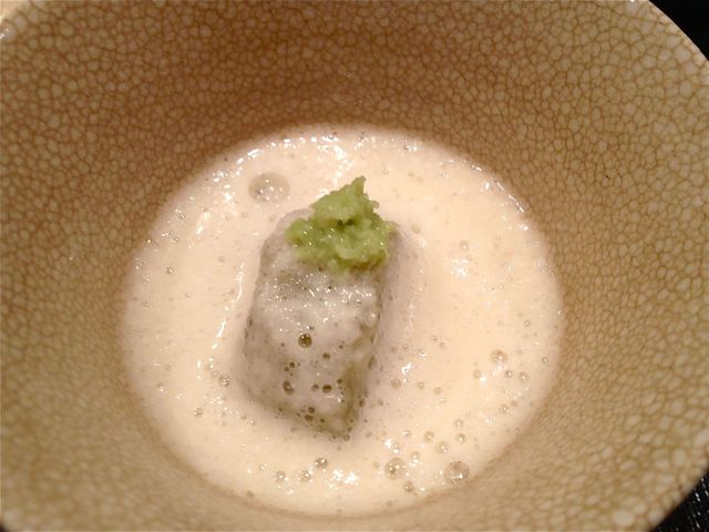 お料理は一度揚げた「甘鯛のお椀」。なんともいえないほどに上品な味わいのお出汁の中で甘鯛が優雅に泳いでいるイメージ。素晴らしいお味のお椀だった。「純米吟醸」もすこぶるおいしい。続いては「茄子の大和芋がけ」。ヒンヤリと冷たい大和芋の中に浮かぶ賀茂茄子は一服の清涼感を運んでくる。